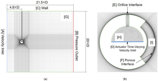The actuation of SJAs has been modelled in various ways. Catalano et al. [6] modelled the actuator as a time-varying velocity inlet while other studies have modelled it as a dynamic surface [39,40]. A time-varying velocity inlet approach is used in this study on a source area within the inner cavity of the cylinder (surface [D] in Figure 4b), as it has been shown by Jain et al. [40] to achieve a very similar velocity profile at the orifice outlet to dynamic actuator models, while requiring only around half the simulation time [40].