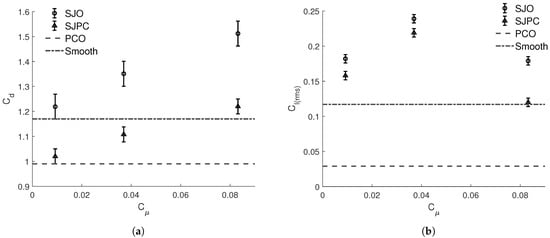 Averaged experimental results of drag and RMS lift coefficient as a function of momentum coefficient for each configuration, with error bars indicating experimental uncertainty. (a) vs. and (b) vs. .