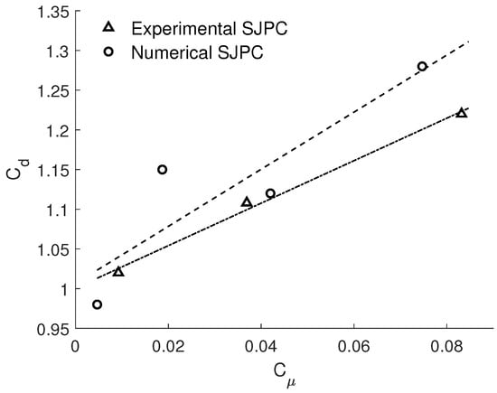 The current SJPC numerical model was validated against the results of the experimental phase. Simulations of a SJPC with = 144 and f = 4, 8, 12 and 16 Hz were carried out to mirror the experimental and actuation frequencies. Figure 6 shows a good agreement between numerical and experimental values when plotted against their respective values. This shows that the current SJPC model is capable of simulating the combined effect of the SJA and porous coating, and in fact appears to overpredict .