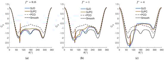 In the = 0.15 case (Figure 7a), the SJO causes no drag reduction and instead decreases leeward pressure on the side containing the SJA. The SJPC pressure distribution lies between the PCO and smooth cases, producing a drag reduction of 15%. This is significantly smaller than the reduction of the PCO case, indicating that the operation of the SJA in this condition hinders the effect of the porous coating. The = 1 case (Figure 7b) shows the behaviour of the models when the actuation frequency is equal to the natural shedding frequency. In both the SJO and SJPC, there is a large decrease in pressure just upstream and downstream of the SJA orifice. The pressure on the lower portion of the lee (180°–270°) is generally higher than the = 0.15 case. However, this increase does not counteract the decrease near the SJA, culminating in a higher value of 1.24 for the SJO case. The = 4 case (Figure 7c) shows that at this operating condition, both the SJO and SJPC outperform the PCO case, with respective drag reductions of 46% and 45%. Despite the large pressure decrease either side of the SJA orifice, both cases increase the leeward pressure (130°–180°) more than in the PCO case. Both the SJO and SJPC cases have similar pressure distributions, indicating that the porous coating has less of an effect at this operating condition. For the = 4 cases, the value of was decreased to 1.8 × 10 to increase the influence of the porous coating in the SJPC case. This alteration had little effect on the values of obtained (<1%) indicating that is the dominant parameter in the current setup. It was decided that future work could use alternate setups to better investigate the influence of .