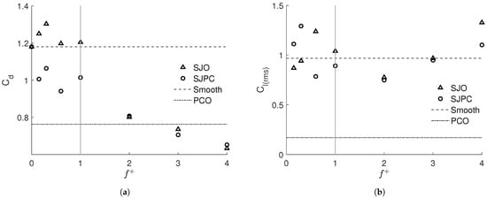 Figure 8 compares the variation in and with for each case tested. It is clear that below = 1, the SJO does not provide any drag reduction, with a maximum drag increase of 11%. The SJPC, however, provides a drag reduction in every case below = 1, albeit a smaller drag reduction than the PCO case. Above = 1, there is drag reduction in each SJO and SJPC case tested referenced to the smooth case, with an optimum reduction at = 4. Drag decreases with actuation frequency above = 1. However, a wider range of values needs to be studied to determine whether drag reduction is saturated beyond this point. In terms of altering lift forces, there is no discernible trend in below = 1, with the SJPC providing decreases for the lower actuation frequencies and increases for higher frequencies. The SJO shows the exact opposite trend. Above = 1, there is a minimum value in , offering a 22% reduction for both the SJO and SJPC cases, before a gradual increase with . While both the SJO and SJPC cases at = 2, 3 give very similar values, there is a significant difference at = 4, with the SJPC offering a much lower value (1.1) than the SJO case (1.33).