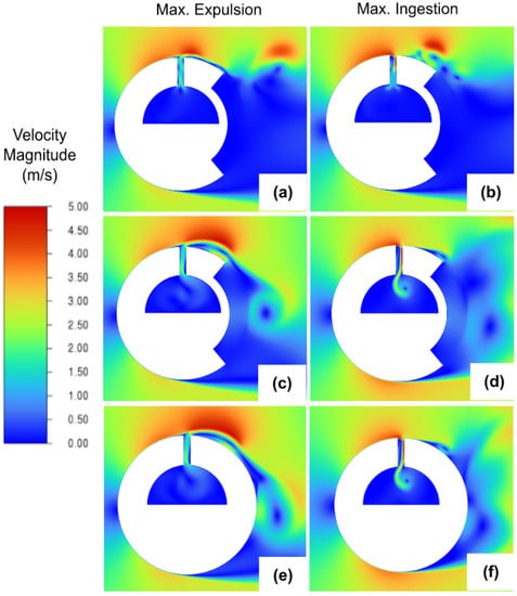 Comparison of instantaneous flow velocity fields at a phase angle corresponding to (a,c,e) maximum expulsion and (b,d,f) maximum ingestion of the synthetic jet: (a,b) SJPC at , (c,d) SJPC at , (e,f) SJO at .