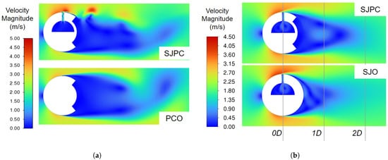 Comparison of flow-fields of velocity magnitude: (a) Instantaneous flow-field for SJPC at = 4 and PCO at comparable instants in the wake vortex roll-up period. (b) Time-averaged flow-field for SJPC and SJO at = 1.