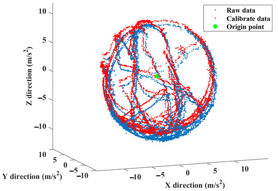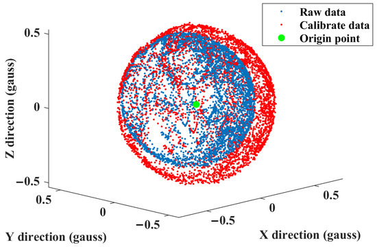 - Calibration of the sensor. The calibration of the sensor mainly includes the calibration of the gyroscope, magnetometer and accelerometer. The gyroscope is a device that detects the angular motion of an object, and its error can be calibrated by calculating the average value and Kalman filter by collecting the angular velocity data of three-axis output of gyroscope in static state. The magnetometer is an electronic device that obtains the heading angle by measuring the strength of the geomagnetic field. Here, the ellipsoid fitting based on the least squares method is used to calibrate the magnetometer. The calibration principle of the magnetometer can be found in the literature [12,25]. The effect comparison after calibration is shown in Figure 4. It can be seen that the center of the sphere formed by the raw magnetometer data is not at the origin, which indicates that there is an obvious offset error in the magnetometer. The fitted data are more evenly distributed on the spherical surface and the center of the sphere is located at the origin, which indicates that the ellipsoid fitting method has achieved better results.