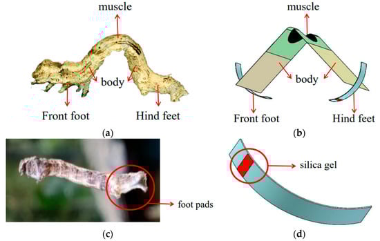 Structure model of bionic inchworm robot. (a) Structure of the inchworm; (b) Bionic inchworm robot structure; (c) The foot pads of the hind foot of an inchworm; (d) Silica gel at the bionic inchworm robot hind foot.