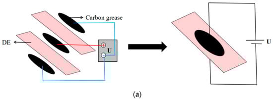 Traditional robots tend to have stiff constructions, which are less safe and flexible [3,4,5]. On the other hand, the soft robot is a novel kind of robot composed of flexible or telescopic materials that has limitless degrees of freedom, remarkable agility, and inherent elasticity [6,7,8]. The driving materials used by existing software robots mainly include: shape memory material [9], responsive hydrogel [10], ionic polymer metal composite [11], pneumatic [12], and hydraulic [13]. Compared with other driving materials, the dielectric elastomer (DE) has the benefits of light weight, low cost, fast response (0.1 ms), high efficiency (60–90%), high energy density (>3.4 MJ·m−3), and large strain range (0–380%) [14,15,16], having substantial advantages in bionic robots. Dielectric elastomer is a kind of hyperelastic thin film material, which attracts much attention due to its wide application in soft robots [17], bionic muscles [18], etc. Acrylic elastomers (VHB 4910 and VHB 4905, 3M) are the most used materials in the experiment because they are available on the market at a low price [19]. However, due to the complex interaction between nonlinear material behavior and driving electrostatic force, DEA is prone to electromechanical instability when driving [20,21,22,23].