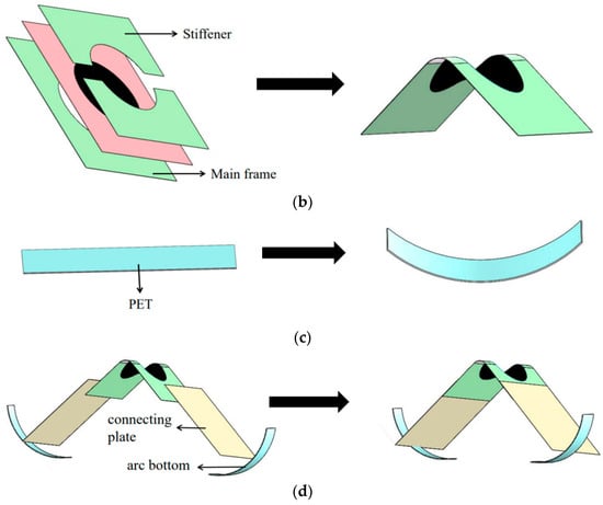 The detailed fabrication of the bionic inchworm robot is shown in Figure 2. We built the robot by integrating components of actuator and feet. First, two layers of dielectric elastomer material (VHB4910, 3M, Shanghai, China) are pre-stretched to 400% × 400%. As the flexible electrodes, carbon grease (NYOGEL-756G, Nye, USA) is smeared on either side of the films (Figure 2a). Next, the finished two membranes are stacked together between the main frame (Polyethylene terephthalate (PET), 0.188 mm thick, China) and the stiffener (PET, 0.25 mm thick). The fulfilled actuator, which is also known as the DEA, automatically bends under the elastic force of the pre-tensioned film, as shown in Figure 2b. Then, the PET plate (0.188 mm thick) is partially heated to type a curved bottom (Figure 2c). Silica gel is applied at the position where the hind foot contacted the ground to simulate the foot pads of the tentacles of the inchworm. Eventually, utilizing PET (0.25 mm thick) as the linked plate, the arc bottoms are connected to both ends of the actuator by cyanoacrylate glue. The finished bionic inchworm soft robot is depicted in Figure 2d, with a total weight of 3.5 g.