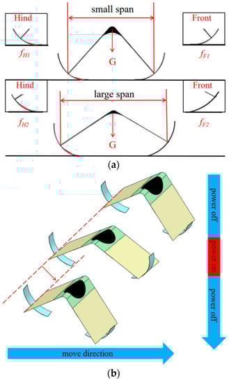 The actuator may be bent by the robot to change the state of contact between its feet and the ground, as seen in the Figure 4a. The distance between the two end points of the PET frame is used to determine the span of the robotic body. The electricity is off and the body is in a small span while at rest. The silicone-coated portion of the rear foot makes contact with the ground at this moment, increasing the friction coefficient of the rear foot relative to the front foot. So, when the robot is in the state of contraction. The span grows when the actuator is powered up. As a result, the position of the rear foot coated with silica departs the ground. Both front and rear feet are in direct contact with the ground. Under these conditions, the friction coefficient of the back foot and the front foot are basically equivalent because both feet are of the same material. So, when the robot is in an extended state. In this case, motion inertia plays a significant role in determining the robot’s subsequent movement.
