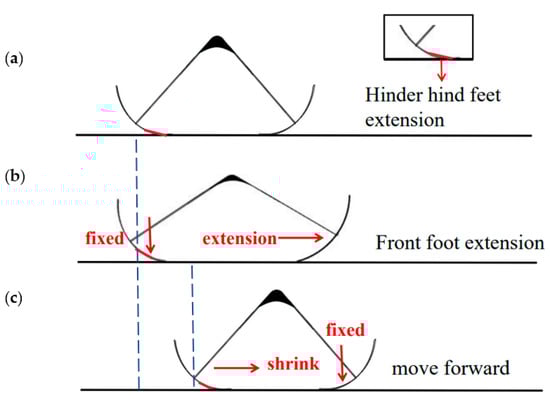 Backward running principle. Positioning the front foot of the robot with a blue dotted line indicates that the robot is moving backward. (a) Power on state, hind foot fixed; (b) Power off state, front foot shrinks; (c) Power on state, front foot fixed, hind foot extension, robot moves backward.