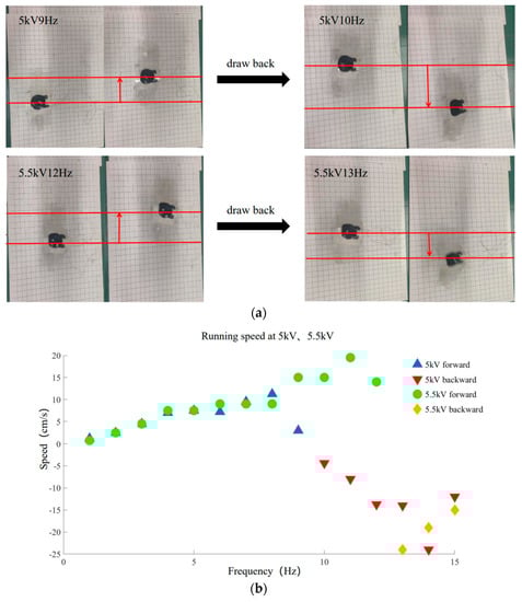 Backward running experiment. (a) Backward running experimental 5 kV and 5.5 kV. Red line positioning robot is used to indicate the running direction of robot; (b) Running speed of 1–15 Hz at 5 kV, 5.5 kV.