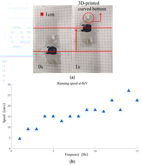 High voltage (6 kV) is used to achieve the quickest operating speed feasible. However, in this case, the friction is insufficient because of the low weight of the arc bottom. The arc bottoms slide on the acrylic plate. Therefore, it is crucial to gain the arc bottoms’ weight under the condition of 6 kV in order to increase its friction. To gain the weight of the arc bottom, a pair of 2 mm-thick arc bottoms are 3D printed (polylactic acid (PLA)), as shown in Figure 8a. The robot after counterweight weighs 8 g. The experimental results are shown in Figure 8b. In this case, the robot with sufficient friction will no longer move backward at high frequency and will move forward all the way. Figure 8b demonstrates that the robot’s speed increases gradually between 1 Hz and 15 Hz after counterweighting. The robot can move at a maximum speed of 270 mm/s at 14 Hz.