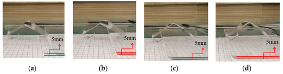 While the front foot remains unaffected, the back foot’s point of contact with the acrylic plate is covered with silica gel. This asymmetric design enables the silica gel in the back foot to perform a variety of functions at varying frequencies, allowing the robot to execute varied movements. The silica gel of the rear foot plays a role in blocking the expansion of the rear foot when the frequency of stimulation is low, allowing the robot movement to advance. The applied high frequency square wave voltage allows the actuator to quickly repeat periodic expansion–contraction when the energizing frequency is increased to a specific amount. Electric stimulation stretches the actuator once more before it completely shrinks to the starting angle. As a result, the robot’s body span is greater at high frequency than it is at low frequency. The silicone that has been applied to the rear foot cannot make contact with the acrylic plate in this condition. It now serves the purpose of blocking the contraction of the rear foot, rather than impeding the expansion of the back foot. When the soft robot contracts, both the front and back feet typically move inward, as seen in Figure 6. The forefoot contracts while the rear foot remains locked in place because the silicone in the hind foot prevents its contraction (Figure 6a). When the robot is powered up, its rear foot extends backward and its front foot is essentially locked due to the inertia of moving backward (Figure 6c). This periodic motion causes the robot to travel in the opposite direction.