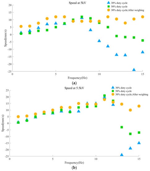 The robot may go backwards when subjected to high-frequency electricity, as shown in Figure 7a. Experimental footage was taken using a cell phone camera, and then the robot’s running distance within a second was calculated to determine its average speed. All investigations used the same robot built with the same actuator to guarantee data consistency. By comparing the running speed of 30% duty cycle and 50% duty cycle, it can be seen that 30% duty cycle is more conducive to the running of the robot (see Section 5). Thus, we used 30% duty cycle uniformly in the running experiment. The experimental results are shown in Figure 7b. At 5 kV and within 1–15 Hz, the robot’s forward movement speed increases as the frequency increases, peaks at 8 Hz, and subsequently decreases. The robot reverses direction at 10 Hz of frequency. After achieving its greatest speed of 240 mm/s at 14 Hz, the rearward movement speed steadily declines. Under the condition of 5.5 kV, the robot’s forward running speed progressively rises, then falls after achieving its maximum speed at 11 Hz. The robot then proceeds at 13 Hz in the opposite direction, achieving a top speed of 240 mm/s. As frequency rises, the reverse motion velocity steadily decreases.
