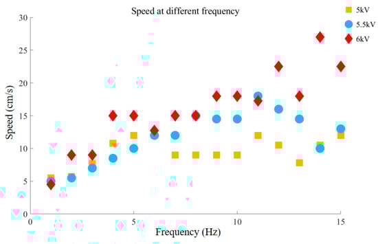 When the robot only moves forward after gaining weight, the running speed of the robot at three voltages is also compared. It can be seen that the forward running speed of the robot shows the law of 5 kV < 5.5 kV < 6 kV (Figure 11). In other words, the speed of the robot is proportional to the excitation voltage. The voltage induced compression force Factive can be considered as the product of an equivalent Maxwell stress and an equivalent cross-sectional area of the actuator associated with the deformation [33]. Since the Maxwell stress is proportional to the square of the electric field, Factive can be written as: