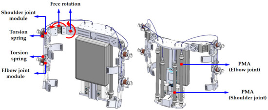 The early UPESs were mostly motor-driven, with a heavy structure, high price, and lack of flexibility. The pneumatic muscle actuators (PMAs), with characteristics similar to those of biological muscles, have the merits of a higher power-to-weight ratio, better flexibility, and lower cost than motors. PMAs are also known as McKibben pneumatic artificial muscles. They consist of a flexible, economical, and safe actuator in which application range is pervasive [4,5,6]. The PMA structure is covered with a woven mesh-like high-strength fiber material, while the elastic rubber tube is on the inside, fixed by metal pieces at the upper and lower ends. After the PMA is inflated and deformed, the rubber elasticity generates internal stress and forms radial expansion. The fixing element seals and transmits the force. The axial direction generates contraction force due to the elasticity of the rubber. The expansion and contraction tension of the PMA is similar to that of an animal muscle [7]. Abe et al. utilized thin McKibben muscles and intertwined them into a flexible 18-woven structure to design new upper limb assistive clothing driven by PMAs [8]. Its characteristics were the same as McKibben’s pneumatic artificial muscles, but its special braided structure increased the PMA contraction. However, the special construction made the auxiliary suit only applications in low-load environments. Ohta et al. [9] proposed a 7-degrees of freedom (7-DOF) exoskeleton system with PMAs and a servo motor composite design. This system needed to be equipped with a variety of sensors, and the overall mechanical system design was too complicated for practical application. Tsagarakis et al. [10] used PMAs to drive a unilateral UPES’s shoulder, elbow, and wrist joints through antagonism, but in this driving mode, the three joints had to use six sets of PMAs and proportional-pressure valves. Therefore, the burden on the wearer was heavy, and the production cost was high. Chen et al. [11] used four PMAs to drive the four joints of the UPES. The design used a single-PMA per the corresponding joint. This system mounted all of the PMAs to the rear frame, giving the UPES completeness, although, in this driving method, the shoulder joint could only be restored to its original position by the weight of the hand. Therefore, each PMA had to add a series spring to store the restoring torque [12] so that the shoulder joint could return to its original position. Such a design is bound to increase the overall structural space. Sugar et al. developed a wearable UPES RUPERT [13], which used dual-PMAs to actuate a single joint through antagonism as its driving motion method to complete active-assisted motion with four degrees of freedom. Wei et al. improved RUPERT IV [14], a wearable UPES with 5-DOF, increased the rotational degrees of freedom of the shoulder, and proposed a closed-loop control based on PID and an iterative learning controller (ILC). RUPERT IV also used dual-PMAs to actuate a single joint through antagonism to complete the upper limb assistance with five degrees of freedom. Its PMAs, placed next to the upper limbs, were a complex structure weighing as much as 95 kg, so it needed to double the overall drive torque and limit the wearer’s movement space.