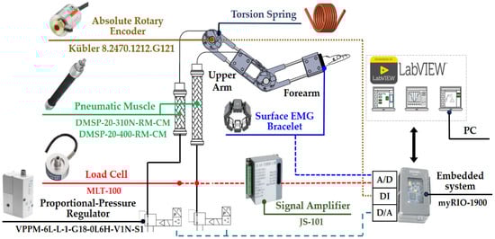 Figure 3 shows the unilateral wearable UPES layout with a structure similar to that of human upper limbs. We took advantage of the inflation and deflation of the PMA to simulate the motion of flexion of the bones to enable the joint to rotate. The unilateral wearable UPES consists of two joint rotation modules that serve to assist in the rotation of the shoulder and elbow joints. A torsion spring is embedded in each joint for energy storage and replaces the mechanism design of using dual-PMAs with a pulley, as shown in Figure 4. When the assist power force is not activated, there is a torsion spring with a preload angle in the pulley at one end of the wire. The joint can move freely and return to its original position due to the torsion spring. When the assistance power is activated, the pressure is supplied to the PMA through the proportional-pressure regulator. The PMA contracts under pressure, and the pulley is driven to rotate to flex and extend the joints. The wearable UPES has two air source input modes. The first is to supply air directly through the air compressor. The second is configuring a small air tank in the wearable UPES to provide the air pressure source and can be used four times in one filling. The parameters of the torsion spring used in wearable UPES are shown in Table 1. The load cells were installed at the end of the PMAs to measure the provided assist force of the PMA. The measurement signal of the load cell was amplified and transmitted to the embedded system through the analog channel and was compared with the power assist trajectory for feedback control. In the experiment, the amplifier amplifies the measurement signal of the load cell and transmits it to the embedded system through the analog channel to compare and calculate the control error with the set power assist target. The control algorithm can calculate the control voltage of the proportional-pressure regulator based on the control error, which adjusts the pressure to drive the PMA and achieve the assist force closed-loop control of the PMA. Table 2 shows the hardware specifications of the wearable UPES. The system controller adopts the embedded system (myRIO-1900, National Instruments). The measurement and control algorithms required for the experiments are mainly developed in the LabVIEW environment. We used the wearable UPES, as shown in Figure 2, to verify the feasibility of the proposed mechanism and the performance of the controller.