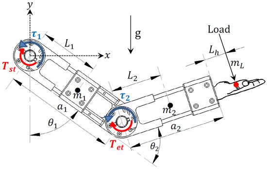 The wearable UPES design only assists the shoulder and elbow joints’ flexion and extension degrees of freedom. The others are passive degrees of freedom and only follow the wearer’s movement. The dynamic model of a one-sided wearable UPES is shown in Figure 5; and are the masses of the upper arm and forearm, and are the distances from the shoulder joint and the elbow joint to the center of mass, is the mass of the load, and is the distance from the center of mass of the load to the endpoint of the mechanism. The dynamics model of the one-sided wearable UPES is derived using the Lagrange method, and the function is defined as the total energy of the mechanical system. This total energy is the sum of kinetic energy, , and potential energy, :