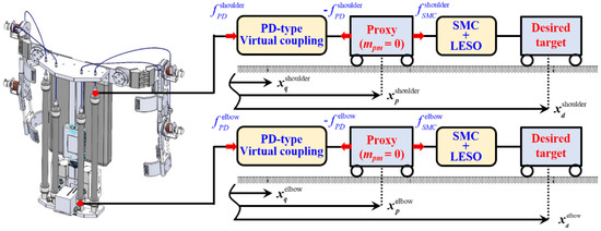 The principle of the proposed IPSMC-LESO is illustrated in Figure 6. The actual controlled object of the IPSMC is connected to a virtual object, called a proxy, utilizing a proportional derivative (PD)-type virtual coupling (a PD controller). Therefore, the PD controller generates the interaction force, , between the actuator and the proxy. Meanwhile, the proxy is also controlled by an SMC with LESO, which imposes the force, , to track the desired power assist target. As shown in Figure 6, and are the proxy’s position and velocity, and , , and are the desired position, velocity, and acceleration, respectively. Before designing the IPSMC-LESO, we first defined the two sliding surfaces, as below: