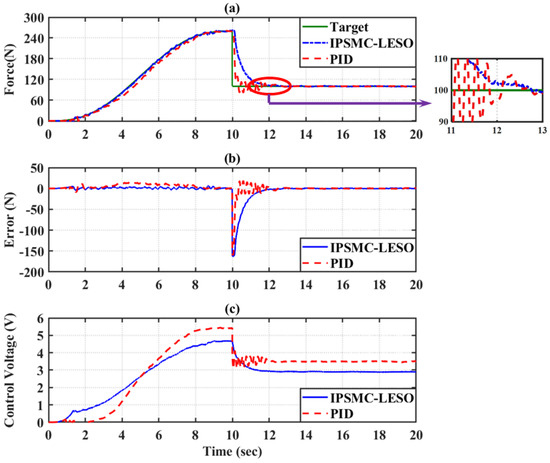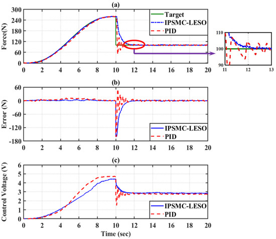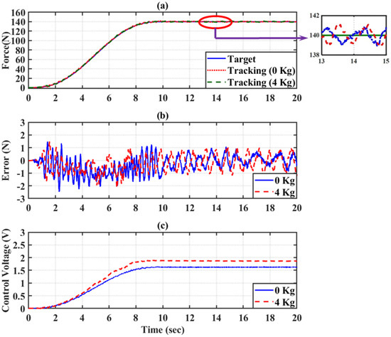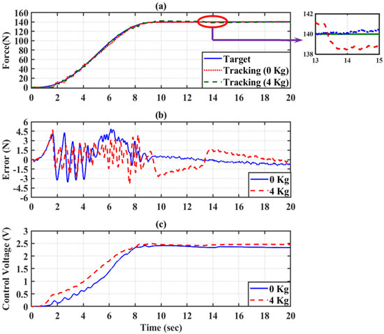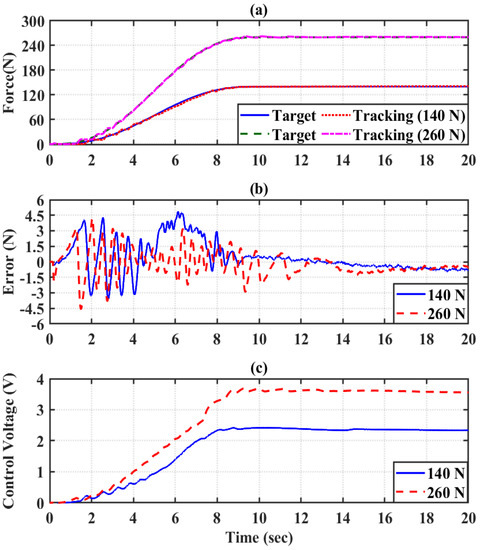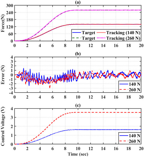 Elbow joint power assist control with 140 N and 260 N at no load. (a) Output tracking response; (b) Control error; (c) Proportional-pressure regulator control voltage.