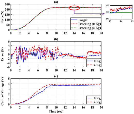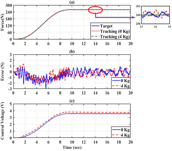 Shoulder joint power assist control with 260 N at a 4 kg load. (a) Output tracking response; (b) Control error; (c) Proportional-pressure regulator control voltage.