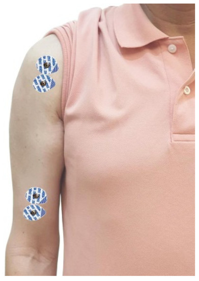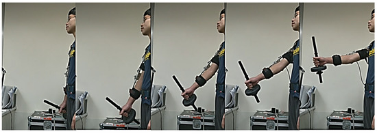 To test the actual power assisting effect of wearing the wearable UPES, we verified the result by measuring the sEMG signals of the anterior deltoid and biceps brachii of the upper limb of the wearer. This experiments used the sEMG instrument of Shimmer Company. Four healthy men were tested in the experiment. The subjects were asked to lift 0, 2, 4, and 6 kg of bar plates with their upper limbs both with and without wearing the wearable UPES. The number of lifts was repeated three times, and the interval between each experiment was 1 min. The upper limb lift process is shown in Figure 16. Non-invasive surface electrode patches and button-type electrode wires were used for measurement. The actual patch positions, as mentioned earlier [36], were respectively attached to the anterior deltoid and biceps brachii, as shown in Figure 17.
