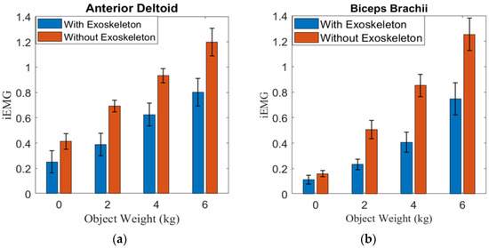 iEMG compares different subjects with and without wearable UPES. (a) anterior deltoid; (b) biceps brachii.