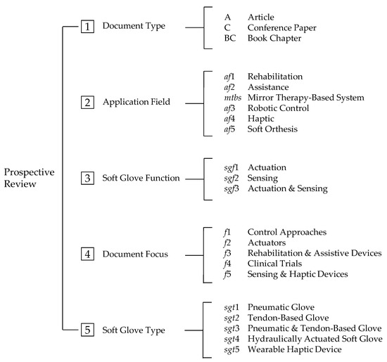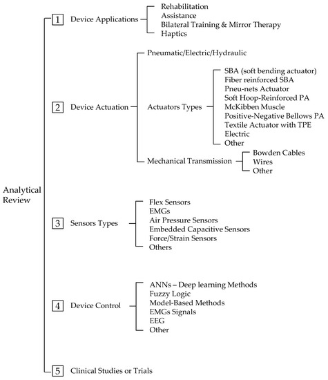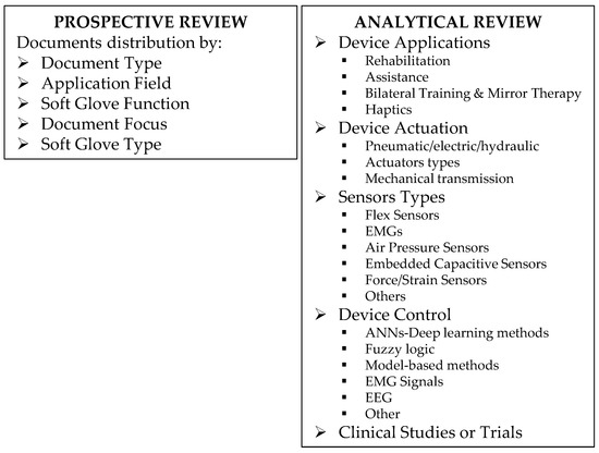 Therefore, the focus of this paper will be on actuation, sensing, control, and purpose of soft gloves, considering the rehabilitation, assistive, and haptic application areas. In detail, the proposed literature review presents two different analysis levels: a prospective review, and an analytical review. The first one is a chronological analysis to map the publication distribution over time, by application field, function, actuation and article focus, and design solutions, with the aim of identifying the emerging trends. The analytical review describes the principal design solutions for soft gloves proposed in the literature by application area, obtaining an in-depth overview of the more recent and most used technologies for soft gloves actuation, sensing, and control techniques. Figure 1 schematically shows the two main levels of analysis, prospective and analytical, and the main aspects investigated in each of them.