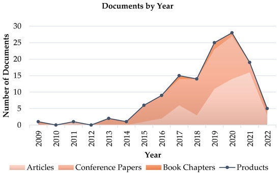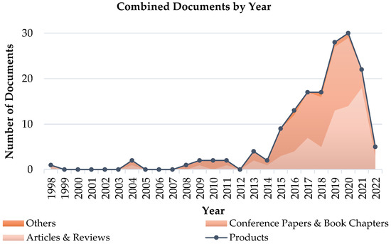 Number of published documents by year, collected by publication type. Classes are reported as a stack plot, and the total amount of products by year is reported in black line with dots.