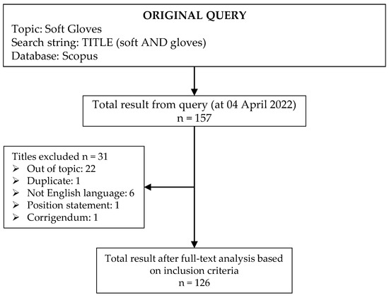 - The study treated aspects related to soft gloves other than those stated in the inclusion criteria (as, for example: soft glove contamination during tissue surgeries, tactile perception investigation, therapists’ evaluation of the perceived usability and utility of wearable soft robotic);