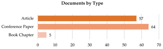 Among the final 126 selected documents, no reviews have been detected. As Figure 7 and Figure 8 depict, the dataset is composed of 57 articles, 64 conference papers, and 5 book chapters, mostly published from 2014. The well balanced distribution between journal papers on one side and other publication types on the other, suggests that soft gloves-related technologies represent an already stably addressed topic in scientific literature, and that it is also quickly evolving.