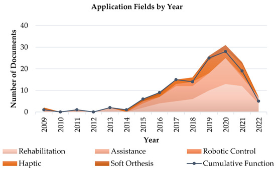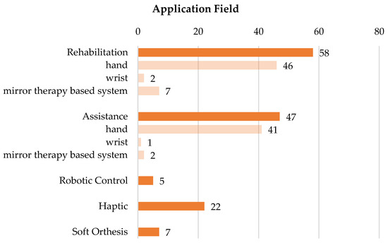 Most of the documents focus on clinical application, primarily rehabilitation (58 products, 46%), and assistance (47, 37%) to follow. Figure 9 provides an insight into the identified application fields, with detail of the interested anatomical districts for the two most populated categories, i.e., rehabilitation and assistance. The additional sub-class, labeled as a mirror-therapy-based system, highlights an explicit indication in the text of the suitability of the described device as a tool for this specific kind of therapy. Fewer documents (7, 6%) refer to the use of soft gloves as soft ortheses, i.e., functionally equivalent to basic tools in the movement of the hand, or as haptic devices (22, 17%), for instance, for the remote control of external systems like rovers [17], as well as hand motion tracking and recognition [18]. The distribution of the soft gloves for application fields categories over time (Figure 10) shows a similar growth trend from 2014 to 2020 for rehabilitative, assistive and haptic soft gloves.