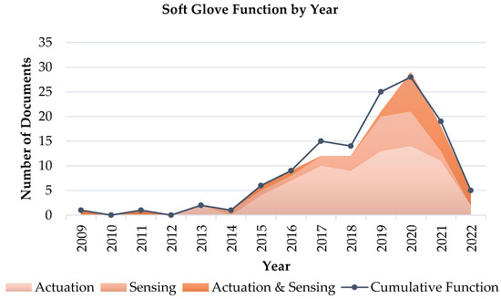 Focusing on the expected functionality of the soft gloves, presented in Figure 11, literature reveals that most of the devices has been conceived to actuate the limb (72 papers, 57%), and about three times less to capture hand state and motion information by sensors (24, 19%). A similar amount of described gloves (21, 17%) finally integrates both the functions of actuation and sensing. As Figure 12 depicts, soft gloves with integrated function are especially present in the last years, since 2019.
