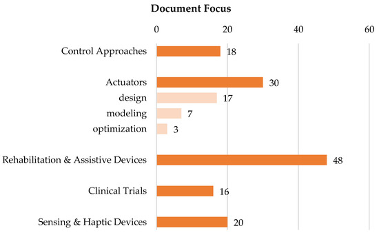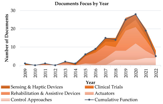 Analyzing the documents in terms of paper focus (see Figure 13), most of the products present clinical-related topics: in particular, 38% of the documents refer to rehabilitation and assistive devices, and 13% to clinical trials. Actuators are the second most addressed topic (30 papers, 24%), with particular attention paid to the design of new actuators (17 documents). Sensing and haptic devices and control approaches are the almost equivalently investigated, with 20 and 17 documents (16% and 13%), respectively. Finally, Figure 14 describes the evolution of the main addressed topics in time, revealing that papers especially focusing on control strategies for soft gloves have only been present in most recent years.