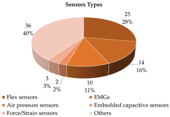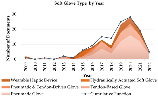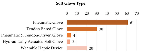Finally, Figure 15 and Figure 16 highlight the distribution of soft gloves among device types and their evolution in time, respectively. Most of the gloves can be classified as pneumatic systems (61 papers, 48%), and tendon-based gloves follows (30, 24%). The combination of pneumatic and tendon-driven systems is present in the gloves of just three papers (2%), and a similar number of documents describes hydraulically actuated gloves (4 documents, 3%). Wearable haptic devices are finally presented in 16% of the investigated documents (20). The analysis of Figure 16 reveals that the increase in the number of published papers of the last years is especially due to the contribute of the pneumatic gloves category.