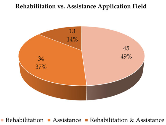 Actuated soft gloves, which contribute to move the fingers and/or the wrist, are mainly developed for rehabilitation or to assist disable people in ADLs. The design of these two classes of robotic hand glove (rehabilitative and assistive) is based on different requirements, almost mutually exclusive [19]. The main requirements for assisting hand exoskeletons are minimum weight and maximum mobility. Therefore, they should: be light and portable, minimize the wearer’s discomfort by conforming to the hand anatomy, allow considerable displacements without restricting the mobility of the injured hand joints, and be easy to wear. Rehabilitative gloves have a precise hand motion control as the main design requirement. They are mechanically robust, not necessarily portable, and without stringent limitations on their weight, or need for mobility as much. On the other hand, a common requirement for both is safety in human–robot interaction. Soft gloves, with their inherent compliance, are particularly suitable for allowing this safety. Some robotic gloves are specifically designed for rehabilitation and others to assist. However, from the analysis carried out in the prospective reviews, it emerges that despite these different functional needs, some devices are proposed for both rehabilitation and assistance. In the analyzed literature, 45 devices are for rehabilitation only, 34 for assistance only, and 13 for both (Figure 17).