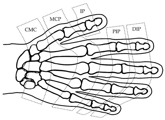 Basic nomenclature for the hand articulations, with Distal (D-) and proximal (P-) inter-phalangeal (IP) articulations, and metacarpo-phalangeal (MCP) and carpo-metacarpal (CMC) articulations.