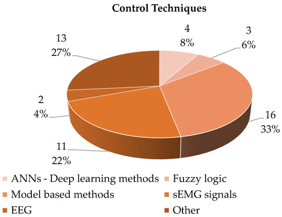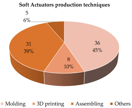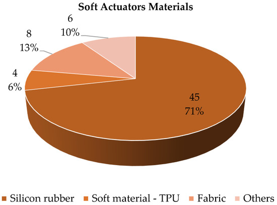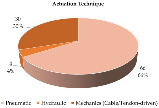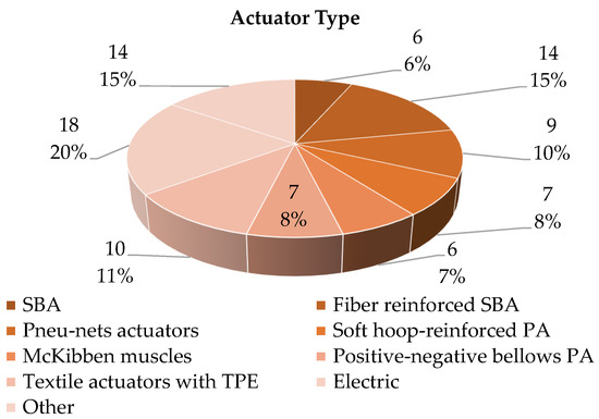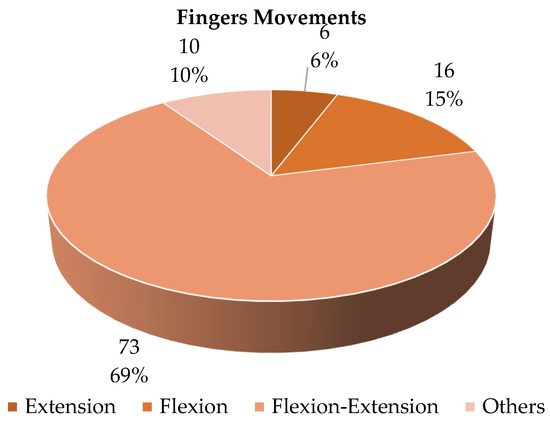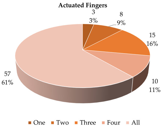 Figure 19 shows the distribution of the soft gloves analyzed as a function of the number of actuated fingers. It can be seen that most of the devices (61%) have been developed to move all the fingers. In terms of significant percentage, the movement of three fingers is the principal alternative (16%), with the specific thumb, index and middle finger. As a matter of fact, the movement of these three fingers makes it possible to carry out a significant number of essential functions and gestures ADLs. The actuation of a single finger or two is found in a very limited number of devices, and in these cases it is motivated by the realization of a proof of concept of the actuation system.