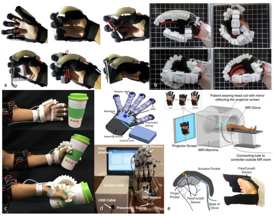 The MR-Glove (Magnetic Resonance Glove) in Figure 20d [45], with soft actuators made of silicone elastomers with a corrugated-fabric layer, is MR compatible as it contains no ferromagnetic materials and operates pneumatically, thus allowing to perform fMRI (functional Magnetic Resonance Imaging) studies to study brain activities and motor performances during hand rehabilitation and to investigate the functional effects of rehabilitation robotics on brain stimulation. The closing state is achieved with pressurization, while the opening hand state is passively caused by the elastic forces of the elastomers.