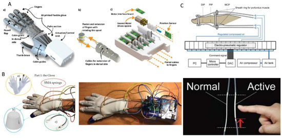 Hands have always been a fundamental interface element between human beings and external physical reality, and today also towards non-physical environments, such as virtual or augmented reality. Soft robotic gloves and soft haptic gloves are wearable devices, which do not impose physical restraints on joint motions, developed to actuate hand movements (this is the case of rehabilitative or assisting gloves) or to sense and/or give the user sensory feedbacks (in the case of haptic gloves). The actuation of hand joints is used in robotic rehabilitative exoskeletons to provide several different kinds of patients, such as subjects affected by rheumatoid arthritis and spinal cord injury or post-stroke patients, with therapeutic exercises at a higher dosage and intensity compared to conventional manual therapy [1,2,3,4]. Hand robotic assisting devices are used to provide support in the activities of daily living (ADLs) for a temporary phase to patients who have the possibility of regaining hand full control, or indefinitely for chronic patients, such as subjects affected by Parkinson’s disease, cerebral palsy, or dementia. Any support that can help to recover the full potential of the hand or at least being able to carry out ADLs with greater easiness has a strong impact on the quality of life, given the fundamental importance of the hand for these activities [5,6].