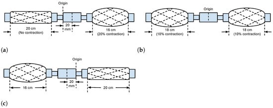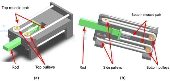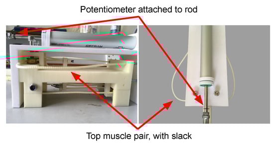 The main difference between the configuration used in this study and that used by other researchers [,] is the use of pulleys and the placement of the antagonistic pair muscles on different elevations and in parallel. This configuration is necessary to maximize the rod displacement in the horizontal plane within a small footprint. Other researchers placed the muscles on the same elevation, to the the left and the right of the load, without the use of pulley. Such sonfiguration entails that for a position control of 40 mm, the length of the setup has to be more than 36 cm, as shown in Figure 2. With the use of the pulley–different elevations–parallel system, the prototype is only about 10 cm.