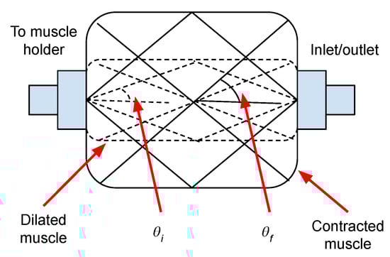 where , P, and are the maximum muscle diameter, applied pressure, and muscle’s braid angle. Since is a constant, at the same pressure, F depends on alone.