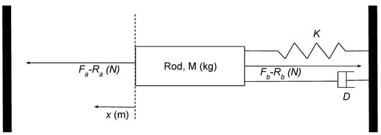 Therefore, based on Equation (1), F is maximum at the start of contraction (). This force moves the rod. As illustrated in Figure 5, as the muscle contracts, increases and F decreases. When the muscle is fully contracted, F equals to zero and the rod stops moving.