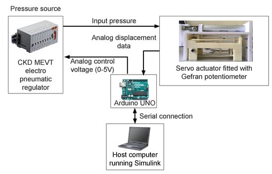 The servo actuator is modelled as a multiple-input single-output (MISO) system. Its inputs are air pressure into the top McKibben muscle pair, , and bottom muscle pair, , whereas its output is the rod displacement, x. The contractile force, F, from a single muscle acting on the rod can be described using Schulte’s formula []