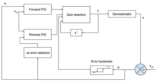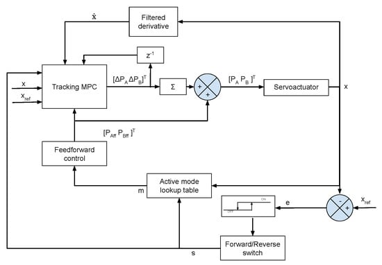 The overall SMPC control system is shown in Figure 9. The controller was developed using Hybrid Toolbox [], Multi-Parametric Toolbox 3.0 [], YALMIP [] and HYSDEL []. A feed forward controller was used in addition to the MPC controller to minimize the settling time. In addition, it ensures that maximum displacement is achieved. A lookup table, Table 3, is used to determine the value of the feedforward signal. The mapping of the table depends on reference signal and forward–reverse switch.