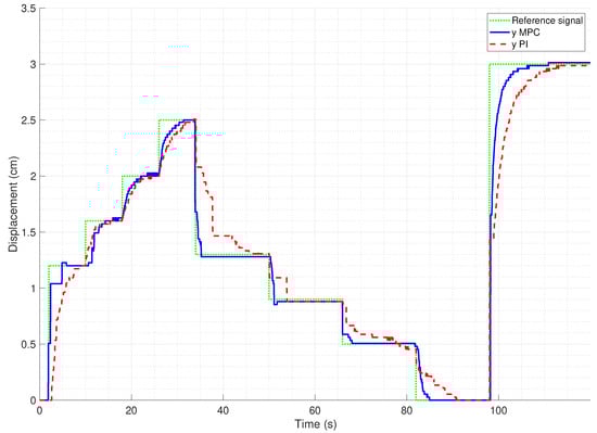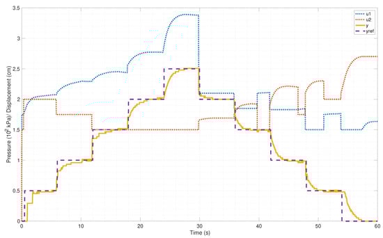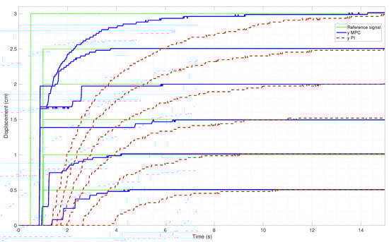 Figure 11 shows the results of set point experiments to compare the performance of the developed SMPC with the GSPID controller. The SMPC performs well to follow the set point with average rise time, , settling time, , overshoot, , and steady-state error, of 1.49 s, 3.69 s, 0.62%, and 0.51%, respectively, as shown in Table 4. Compared to the GSPID controller, the SMPC has smaller average values for all the parameters. This is because the GSPID controller is based on a single-input single-output (SISO) system that is not able to achieve a fine displacement control. Therefore, it is not able to produce a good set point regulation once overshoot occurs. Therefore, it is tuned to get the best steady-state response, i.e., minimal overshoot and steady-state error at the expense of the transient response, i.e., rise time and settling time.