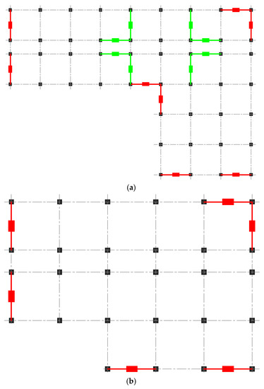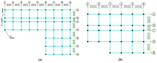 Typical floor plans of the ten-story L-shaped structure model. (a) 1st–6th floor (b) 7th–10th floor.