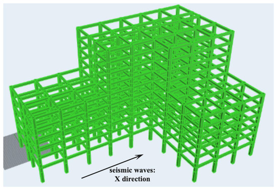 The structure model has both plan asymmetry due to the ‘L-shaped’ floor plan and vertical irregularity due to setbacks above the sixth floor, whose typical floor plans can be seen in Figure 1. In order to truly reflect the spatial torsional vibrations of eccentric structures, the numerical structure in this study was modeled as a three-dimensional beam-column element system [33,34], considering the elastic–plastic deformation of beam and column members under strong earthquakes, as can be seen in Figure 2. The lateral load resistance system of the ‘L-shaped’ structure is strong in one direction but weak in the other, and due to the eccentricity of stiffness in the lateral load resistance system, the building is prone to torsional vibrations on the vertical axis.
