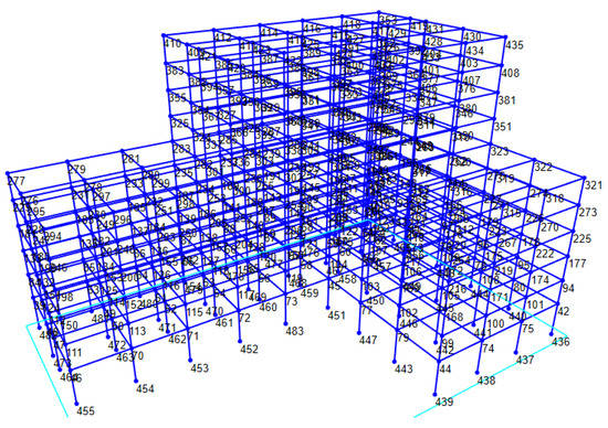 In order to verify the validity and accuracy of the self-programmed structure model in OpenSEES, comparisons of modal analysis results and dynamic time history responses calculated from OpenSEES (version 3.3.0) and SAP2000 (version 23.0) were carried out. The structure model set up in SAP2000 with node numbers can be seen in Figure 3. The El-Centro N-S component ground motions were used in the time history analysis, and the amplitude is scaled to 70 cm/s2. Seismic waves were applied unidirectionally in the X direction of the structure. The damping ratio of all modes was set to 5%.