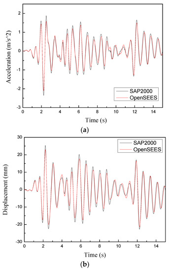 Response comparisons of the structure model in OpenSEES and SAP2000. (a) Acceleration, (b) Displacement.