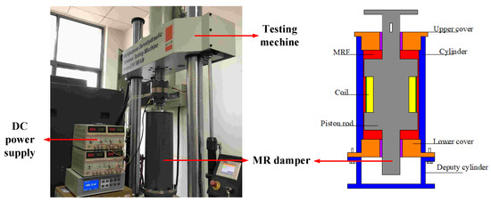 In order to provide experimental data basis for parameter identification of MR dampers, performance tests of a single-coil MR damper were carried out [38], as can be seen in Figure 5. The MR fluid used in this MR damper was the highly stabilized MR fluids based on MWCNTs/GO composites coated ferromagnetic particles prepared in our previous studies [39], and the basic properties of the MR fluid are listed in Table 2.